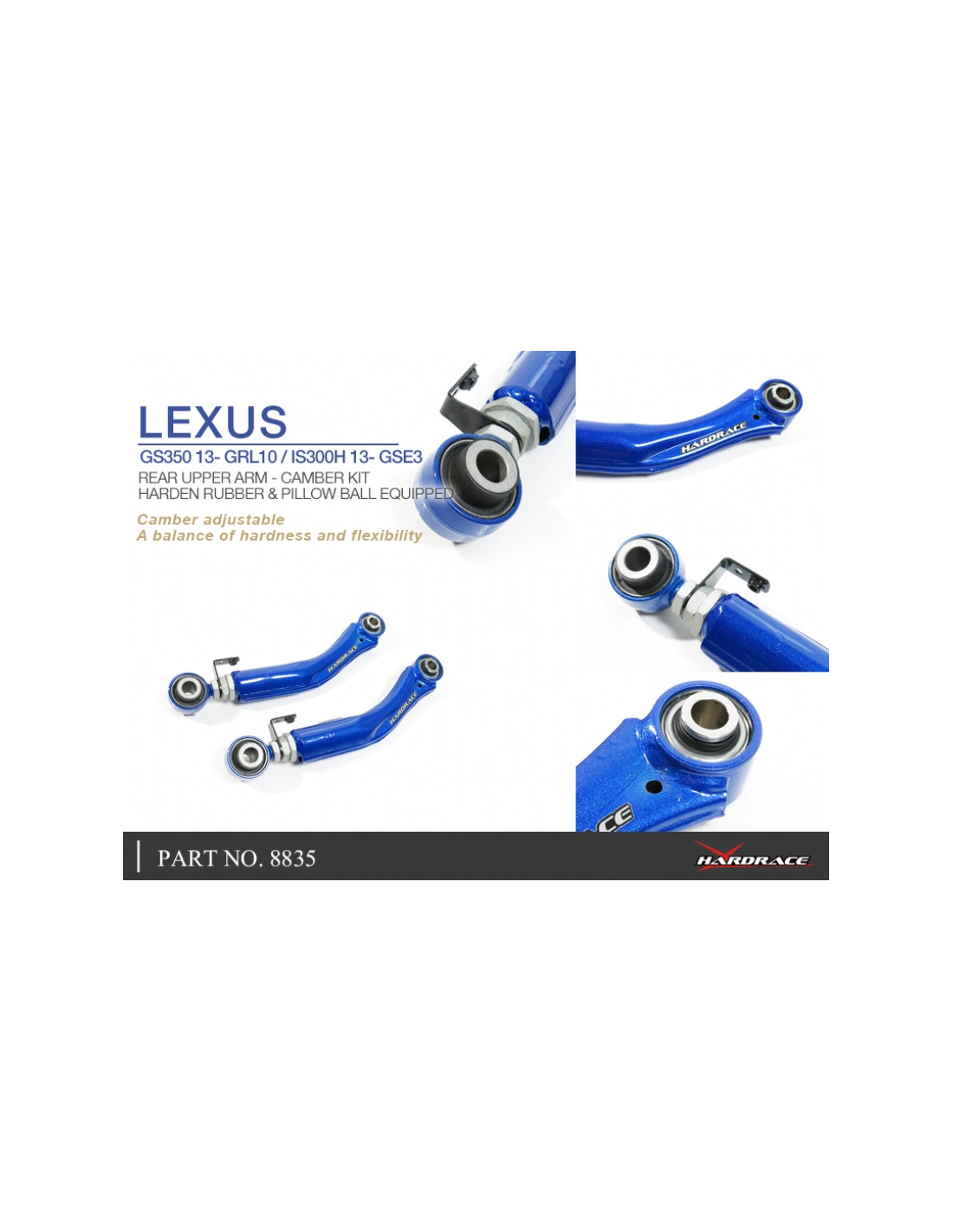 Braccio sospensione Hardrace per Lexus GS, IS, RC. Ideale per migliorare la precisione di guida, la stabilità dell'assetto e la risposta dello sterzo. Caratteristiche dal produttore : - One Side Pillow Ball Bushing One Side Harden Rubber Bushing 2 PCS/SET * Not suitable for RCF