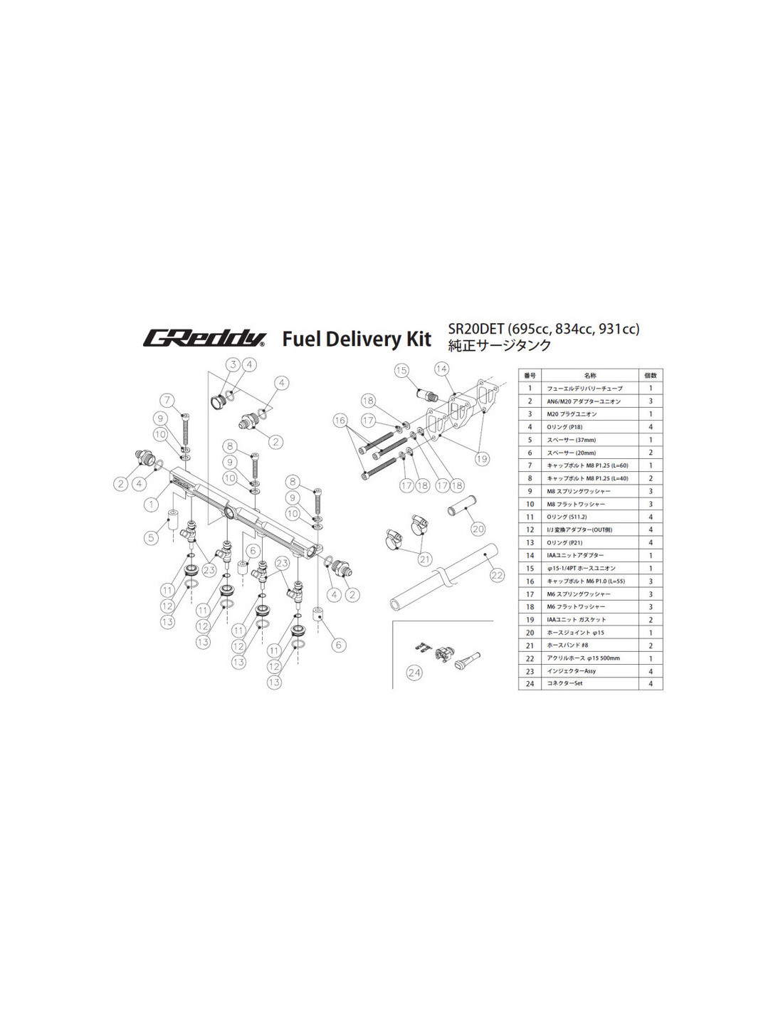 Kit iniettori GReddy Per Nissan SR20DET Black Top (S14 e S15) Portata: 695 cc/min, 834 cc/min, 931 cc/min Tipo: alimentazione dall'alto Sostituzione diretta OEM Qualità e affidabilità impeccabili Codice/i GReddy: 13923310, 13923311, 13923312, 13923313, 13923314, 13923315 Specifiche del kit iniettori GReddy per Nissan SR20DET (S14/S15) Questo kit GReddy, progettato specificamente per i motori Nissan S14 e S15 SR20DET, include un rail di alimentazione e un set di iniettori da 695 cc, 834 cc o 931 cc (a seconda delle esigenze) con connettori e terminali e manicotti per migliorare significativamente l'alimentazione del motore turbo a 4 cilindri Nissan. Sviluppato per essere "plug and play" al 100%, questo kit combina la massima qualità e affidabilità e può essere installato al posto dei componenti OEM, senza richiedere modifiche. Si prega di notare che questo kit è disponibile in due varianti: compatibile con il collettore di aspirazione di serie (serbatoio di compensazione) o compatibile con il collettore di aspirazione GReddy (serbatoio di compensazione). Dati tecnici P/N 13923310 / 13923313 Portata (cc/min): 695 (3 bar) Sistema: alimentazione dall'alto Tipo di spruzzo: conico (9 fori) Connettore: Jetronic (quadrato) Resistenza: 12 Ω P/N 13923311 / 13923314 Portata (cc/min): 834 (3 bar) Sistema: alimentazione dall'alto Tipo di spruzzo: conico (7 fori) Connettore: Jetronic (quadrato) Resistenza: 12 Ω P/N 13923312 / 13923315 Portata (cc/min): 931 (3 bar) Sistema: alimentazione dall'alto Tipo di spruzzo: conico (7 fori) Connettore: Jetronic (quadrato) Resistenza: 12 Ω Kit Dettagli per il serbatoio di compensazione di serie (vedi diagramma) 1) Tubo di mandata carburante x1 2) Raccordo adattatore AN6/M20 x3 3) Raccordo a tappo M20 x1 4) O-ring (P18) x4 5) Distanziale (37 mm) x1 6) Distanziale (20 mm) x2 7) Bullone a testa cilindrica M8 P1.25 (L=60) x1 8) Bullone a testa cilindrica M8 P1.25 (L=40) x2 9) Rondella elastica M8 x3 10) Rondella piana M8 x3 11) O-ring (S11.2) x4 12) Adattatore di conversione I/J (esterno) x4 13) O-ring (P21) x4 14) Adattatore unità IAA x1 15) Raccordo per tubo flessibile ⌀15-1/4PT x1 16) Bullone a testa cilindrica M6 P1.0 (L=55) x3 17) Rondella elastica M6 x3 18) Rondella piana M6 x3 19) Guarnizione unità IAA x2 20) Giunto flessibile ⌀15 x1 21) Fascetta stringitubo n. 8 x2 22) Tubo flessibile acrilico ⌀15 500 mm x1 23) Gruppo iniettore x4 24) Set di connettori x4