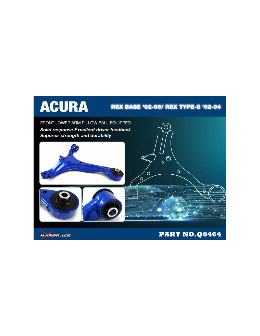Braccio sospensione Hardrace per Honda Integra. Ideale per migliorare la precisione di guida, la stabilità dell'assetto e la risposta dello sterzo. Caratteristiche dal produttore : - M12 BALL JOINT MOUNTING HOLE *FOR INTEGRA BASE Model '02-06 USE *FOR INTEGRA