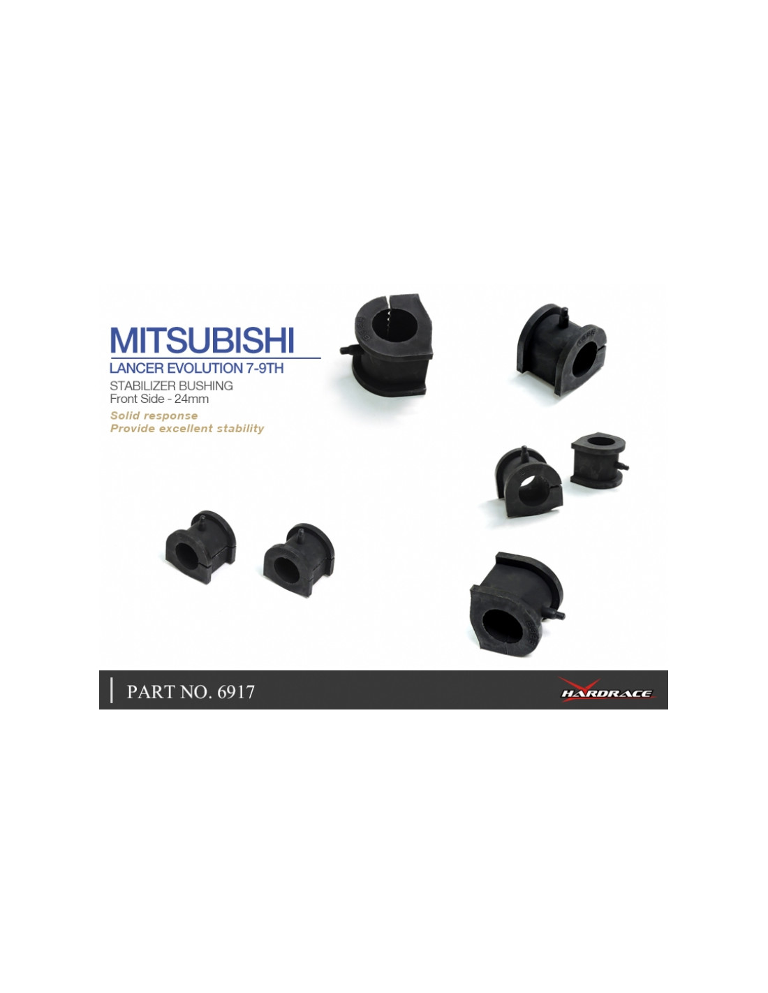 Silent block Hardrace per Mitsubishi Lancer evolution. Ideale per migliorare la precisione di guida, la stabilità dell'assetto e la risposta dello sterzo. Caratteristiche dal produttore : - 2 PCS/SET Front side 24 mm