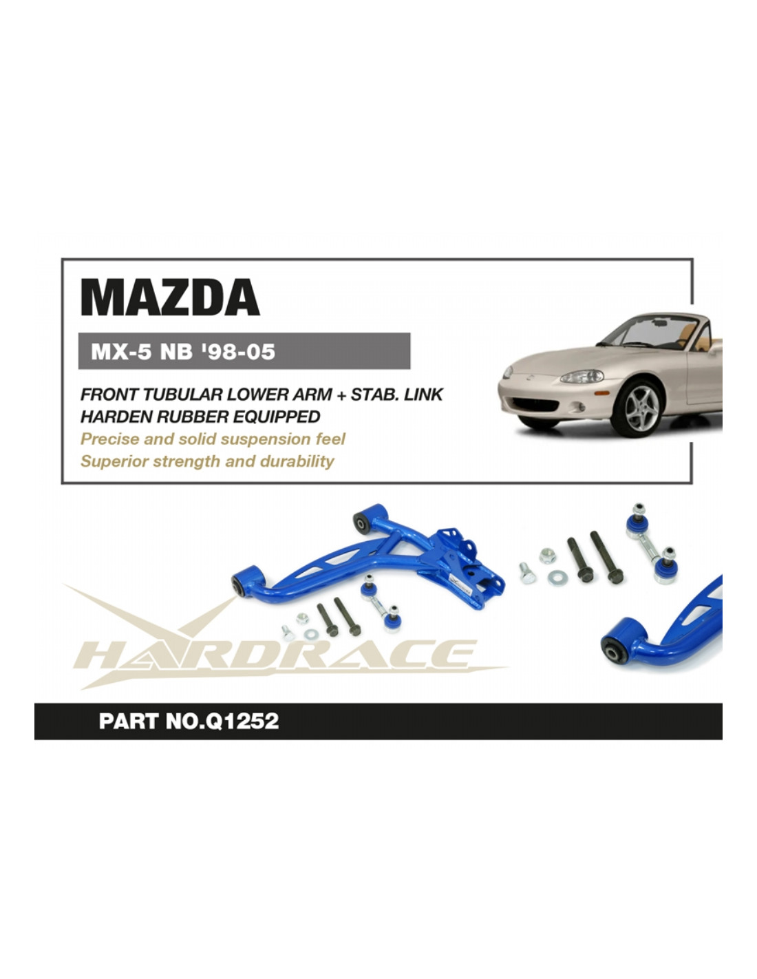 Braccio sospensione Hardrace per Mazda MX-5 MIATA. Ideale per migliorare la precisione di guida, la stabilità dell'assetto e la risposta dello sterzo. Caratteristiche dal produttore : - Tubular Type Harden Rubber Equipped Stab. Link Included 4 PCS/SET