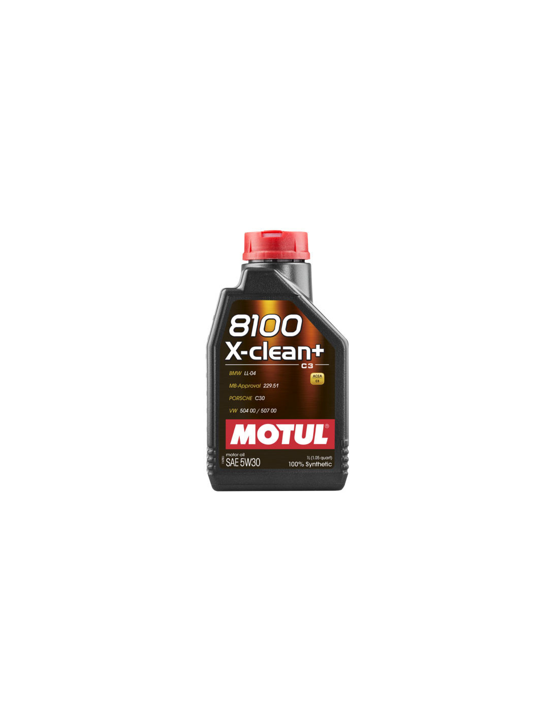 Olio motore Motul 5W30 8100 X-Clean+ Olio 5W30 100% sintetico Approvato da BMW Mercedes Porsche VAG Conforme agli standard sulle emissioni EURO IV ed EURO V (ACEA C3) Compatibile con convertitori catalitici benzina e diesel con o senza filtro antiparticolato (DPF) Confezione: flacone da 1 litro Specifiche dell'olio motore Motul 5W30 8100 X-Clean+ (BMW Porsche Mercedes Volkswagen) Lubrificante 100% sintetico (Mid-SAPS) appositamente progettato per filtri antiparticolato diesel (DPF) e convertitori catalitici a tre vie. Adatto a qualsiasi auto alimentata da motori diesel o benzina Conforme alle normative sulle emissioni EURO 4, EURO 5 ed EURO 6 che richiedono un lubrificante motore ACEA C3 ad alta viscosità HTHS e "Mid SAPS". In grado di raggiungere l'intervallo di cambio olio più lungo consentito dal computer di bordo.BMW Long Life (LL-04)Volkswagen 504 00 / 507 00Porsche C30Mercedes 229,51