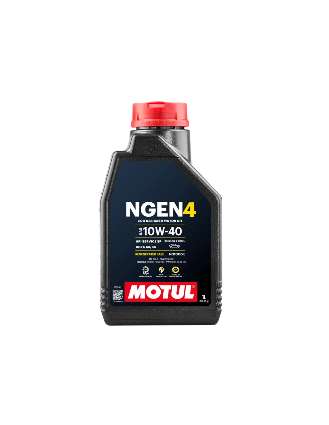 Olio Motul NGen 4 10W40Nuova formulazione più sostenibileOlio motore sintetico con base organicaGrado 10W40Progettato per motori a benzina e diesel recenti e potentiStandard API Service SP ACEA A3/B4Raccomandazioni del produttore: Mercedes PSA Renault VolkswagenVenduto in flaconi da 1 litroSpecifiche dell'olio motore Motul NGen 4 10W40La gamma Motul NGen si basa su un nuovo concetto sostenibile che combina una formula sintetica che favorisce l'uso di oli base rigenerati e contenitori realizzati al 50% in plastica riciclata e riciclabili al 100%. Questo approccio ecocompatibile contribuisce a una significativa riduzione dell'impronta di carbonio del produttore. Questo olio motore 10W40 di alta qualità è stato specificamente progettato per auto moderne e potenti dotate di motori a benzina o diesel, aspirati o turbocompressi, con carburatori o iniezione diretta o indiretta, con o senza catalizzatore. Questo olio è adatto a tutti i tipi di carburante, inclusi benzina con e senza piombo, etanolo, GPL, diesel e biocarburanti. È conforme agli standard API Service SP e ACEA A3/B4 e soddisfa le seguenti omologazioni o requisiti prestazionali: Renault RN0710 - RN0700 VW 501 01 505 00 Mercedes-Benz MB 229.3 Gruppo PSA PSA B71 2300.