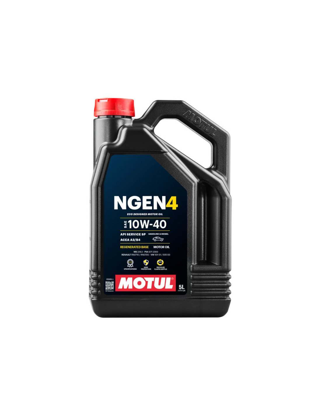 Olio Motul NGen 4 10W40Nuova formulazione più sostenibileOlio motore sintetico con base organicaGrado 10W40Progettato per motori a benzina e diesel recenti e potentiStandard API Service SP ACEA A3/B4Raccomandazioni del produttore: Mercedes PSA Renault VolkswagenVenduto in lattine da 5 litriSpecifiche dell'olio motore Motul NGen 4 10W40La gamma Motul NGen si basa su un nuovo concetto sostenibile che combina una formula sintetica che favorisce l'uso di oli base rigenerati e contenitori realizzati al 50% in plastica riciclata e riciclabili al 100%. Questo approccio ecocompatibile contribuisce a una significativa riduzione dell'impronta di carbonio del produttore. Questo olio motore 10W40 di alta qualità è stato specificamente progettato per auto moderne e potenti dotate di motori a benzina o diesel, aspirati o turbocompressi, con carburatori o iniezione diretta o indiretta, con o senza catalizzatore. Questo olio è adatto a tutti i tipi di carburante, inclusi benzina con e senza piombo, etanolo, GPL, diesel e biocarburanti. È conforme agli standard API Service SP e ACEA A3/B4 e soddisfa le seguenti omologazioni o requisiti prestazionali: Renault RN0710 - RN0700 VW 501 01 505 00 Mercedes-Benz MB 229.3 Gruppo PSA PSA B71 2300.