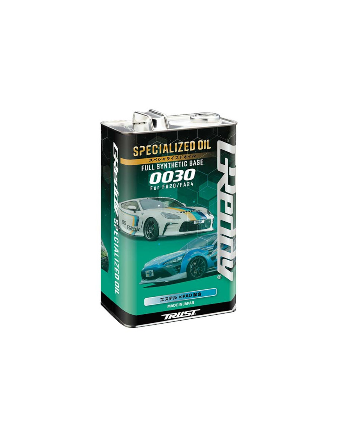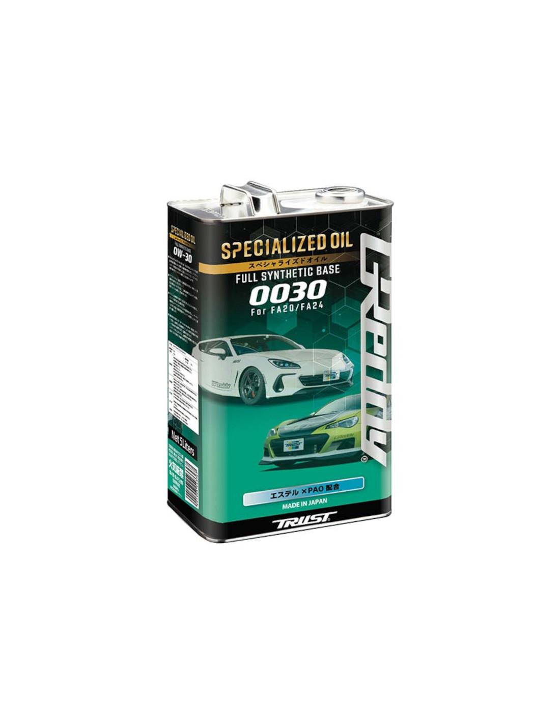 Specifiche dell'olio motore GReddy 0030 per FA20 e FA24 L'olio specializzato GReddy 0030 per FA20 e FA24 è un lubrificante motore ad alte prestazioni specificamente progettato per i motori boxer da 2,0 e 2,4 litri delle Toyota GT86 GR86 e Subaru BRZ utilizzati su strada o in pista. Prodotto in Giappone, questo olio 100% sintetico 0W30 è stato sviluppato con l'obiettivo di ottenere una risposta rapida e di ridurre le perdite di potenza. È una miscela di lubrificanti VHVI (indice di viscosità molto elevato) con elevata stabilità a tutte le temperature e PAO (polialfaolefine) con eccellenti proprietà a freddo. Inoltre, l'olio GReddy 0030 previene l'abrasione del metallo causata dalle partenze a secco e lubrifica e protegge efficacemente l'interno del motore anche in zone ad alta temperatura e carico elevato, come durante la guida in pista. Infine, contiene un FM Booster che riduce il coefficiente di attrito formando una pellicola sulla superficie del metallo per una migliore risposta, un'usura ritardata e una temperatura dell'olio controllata.