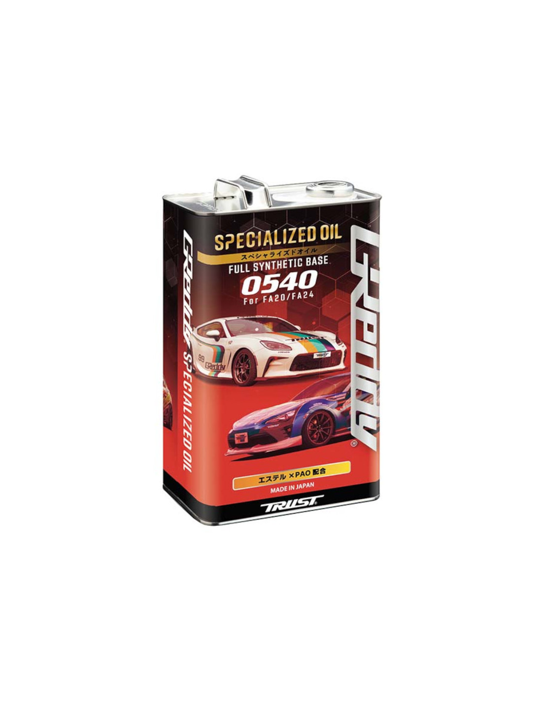 Specifiche dell'olio motore GReddy 0540 per FA20 e FA24 L'olio specializzato GReddy 0540 per FA20 e FA24 è un lubrificante motore ad alte prestazioni specificamente progettato per i motori boxer da 2,0 e 2,4 litri delle Toyota GT86 GR86 e Subaru BRZ utilizzati su strada o in pista. Prodotto in Giappone, questo olio 100% sintetico 5W40 è stato sviluppato con particolare attenzione alla protezione del motore grazie all'eccellente stabilità idraulica e all'elevata ritenzione del film d'olio per far fronte al rapido aumento della temperatura del lubrificante durante la guida sportiva. La sua formula tri-estere garantisce un'eccellente resistenza al calore, un'elevata lubricità e stabilità idrolitica. Inoltre, grazie all'aggiunta di polialfaolefine (PAO), l'olio GReddy 0540 è in grado di resistere a tutti gli intervalli di temperatura e di garantire una rapida lubrificazione dell'interno motore anche durante gli avviamenti a freddo. Infine, contiene un FM Booster che riduce il coefficiente di attrito formando un film sulla superficie metallica per una migliore risposta, un'usura ritardata e una temperatura dell'olio controllata.