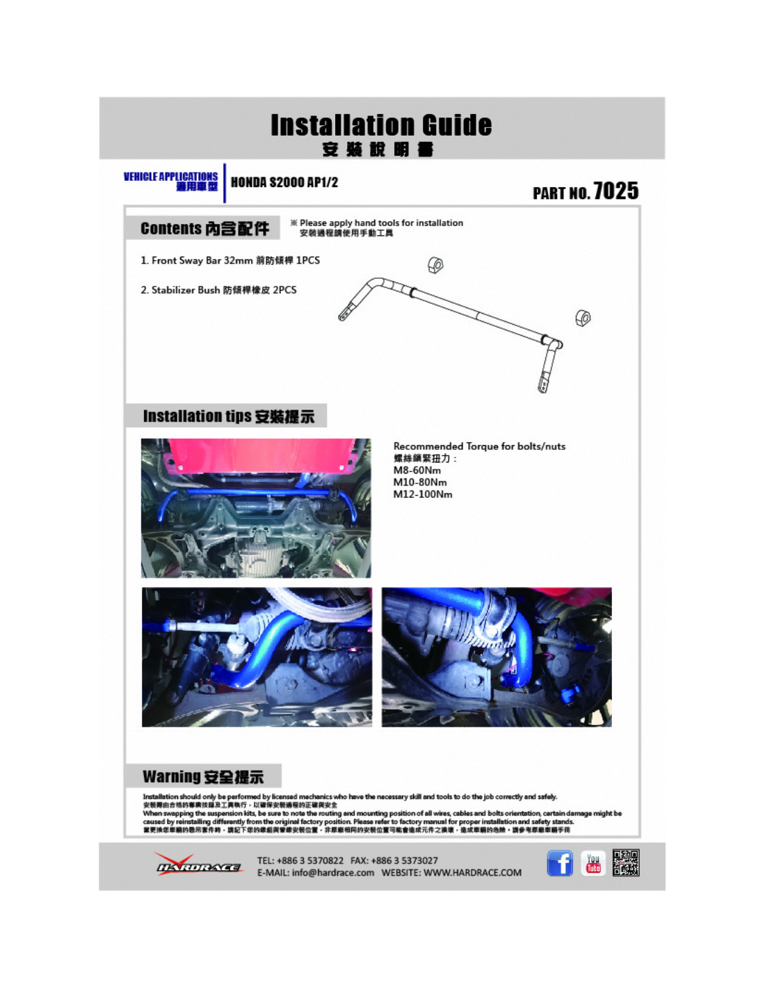 Barra stabilizzatrice Hardrace per Honda S2000. Ideale per migliorare la precisione di guida, la stabilità dell'assetto e la risposta dello sterzo. Caratteristiche dal produttore : - Front 32 mm Bushing Included 3 PCS/SET