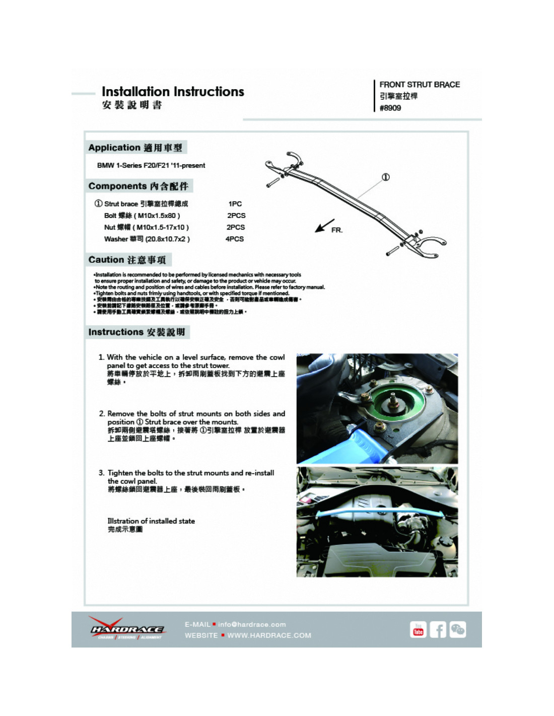 Barra rinforzo Hardrace per BMW 1 Serie. Ideale per migliorare la precisione di guida, la stabilità dell'assetto e la risposta dello sterzo. Caratteristiche dal produttore : - 1 PCS/SET FITS 3-HOLES FRONT STRUT For N13/N55 Engines Only