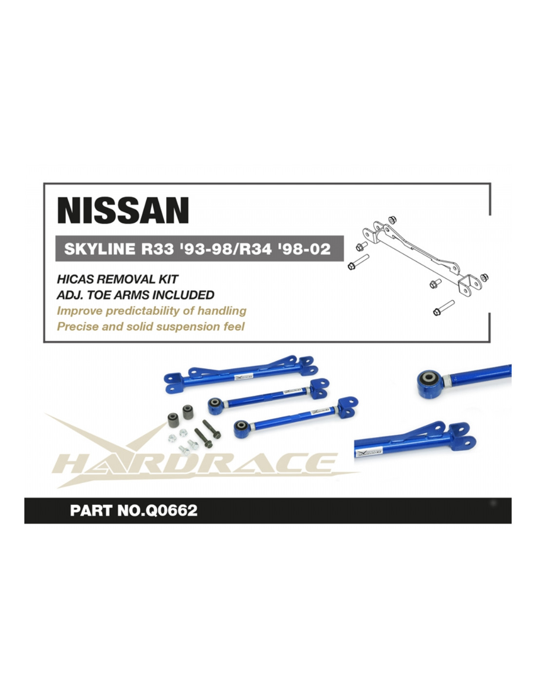 Braccio sospensione Hardrace per Nissan Skyline. Ideale per migliorare la precisione di guida, la stabilità dell'assetto e la risposta dello sterzo. Caratteristiche dal produttore : - * Adjustable Toe Arms Included (Harden Rubber) * Knuckle Bushings Included (Harden Rubber, OD=30.3mm) 5 PCS/SET