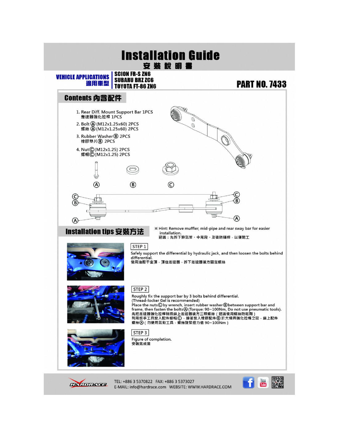 Barra rinforzo Hardrace per Scion FR-S, Subaru BRZ, Toyota 86. Ideale per migliorare la precisione di guida, la stabilità dell'assetto e la risposta dello sterzo. Caratteristiche dal produttore : - 1 PC/SET