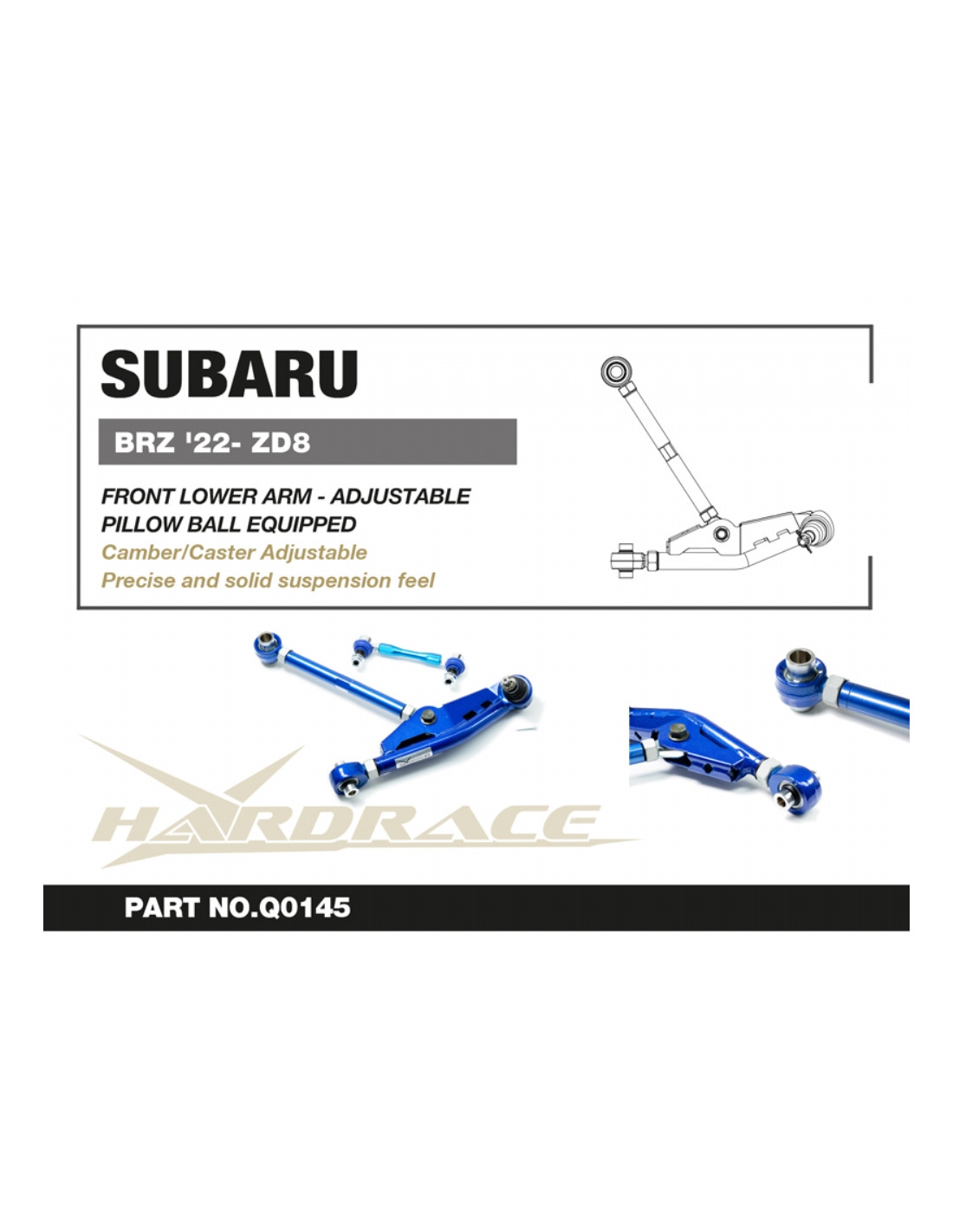 Braccio sospensione Hardrace per Subaru BRZ. Ideale per migliorare la precisione di guida, la stabilità dell'assetto e la risposta dello sterzo. Caratteristiche dal produttore : - Adjustable Pillow Ball Bushing + RC Ball Joint Stab. Link Included 6 PCS/SET