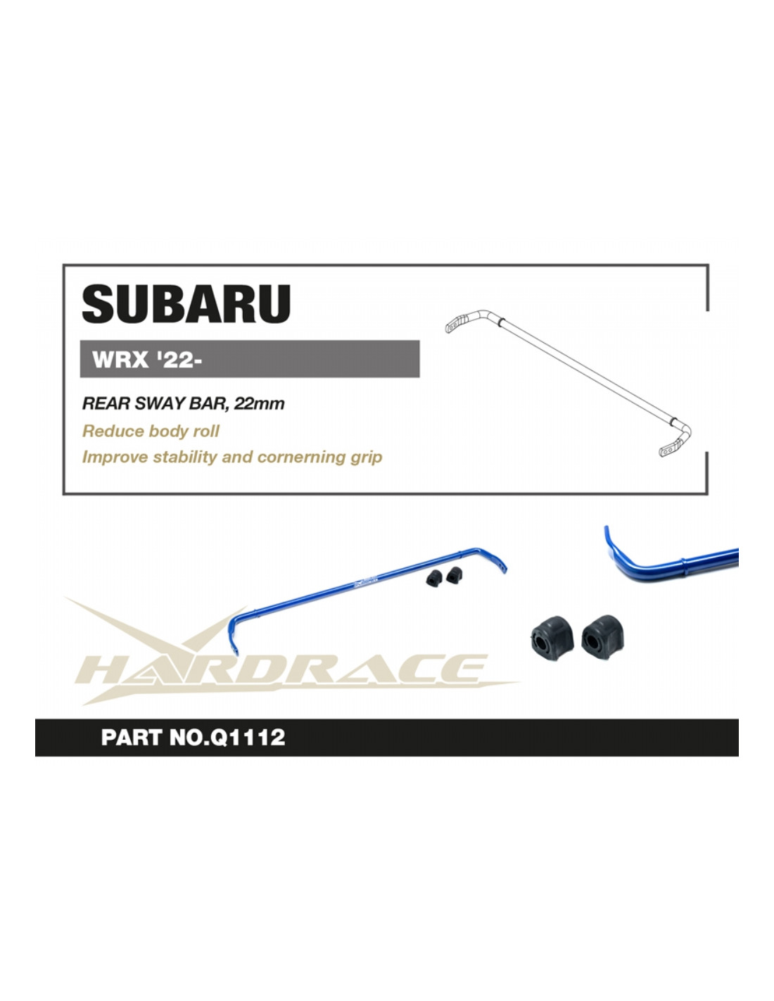 Barra stabilizzatrice Hardrace per Subaru WRX. Ideale per migliorare la precisione di guida, la stabilità dell'assetto e la risposta dello sterzo. Caratteristiche dal produttore : - 22 mm 2-Way Adjustable 3 PCS/SET