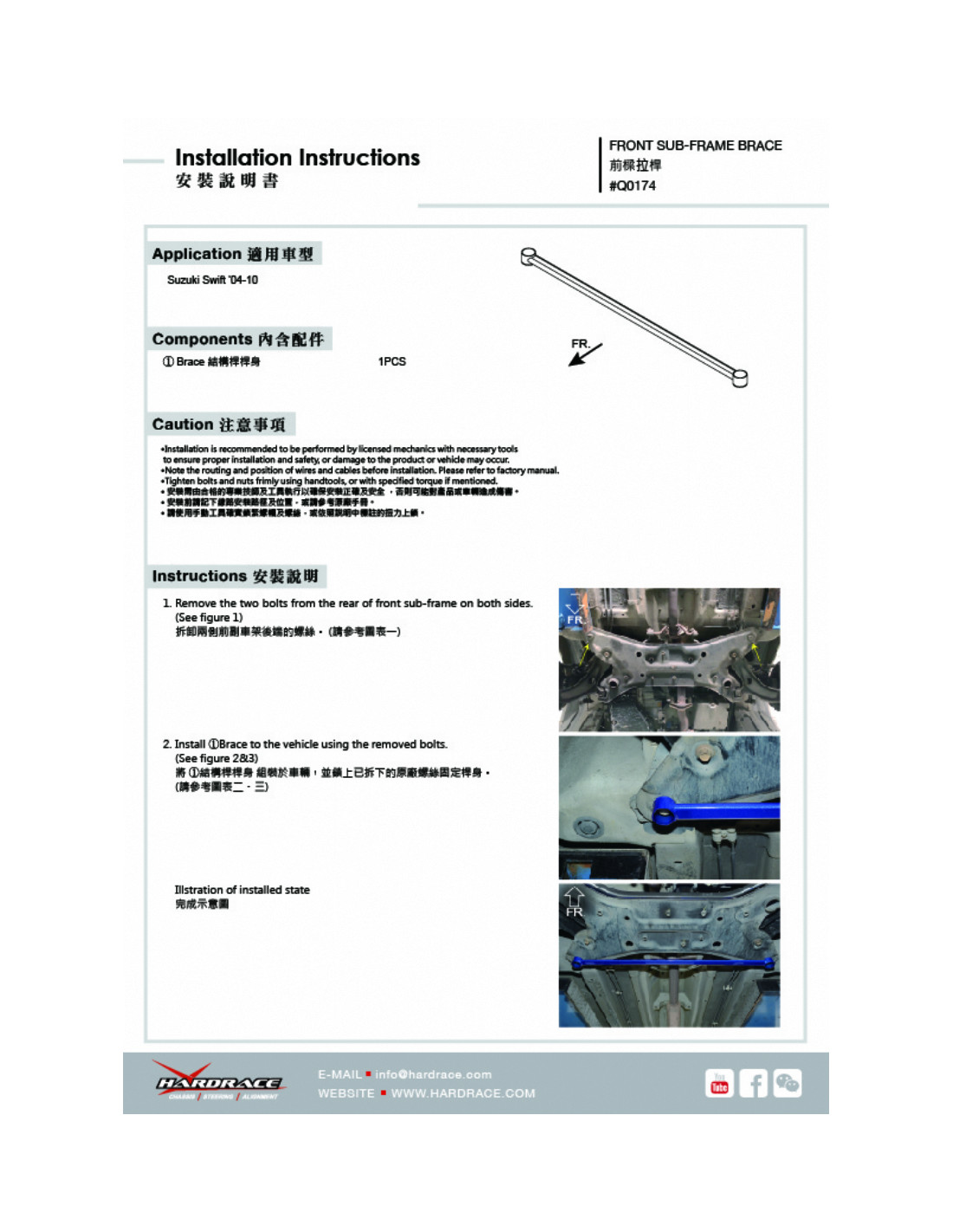 Barra rinforzo Hardrace per Suzuki Swift. Ideale per migliorare la precisione di guida, la stabilità dell'assetto e la risposta dello sterzo. Caratteristiche dal produttore : - 1 PCS/SET
