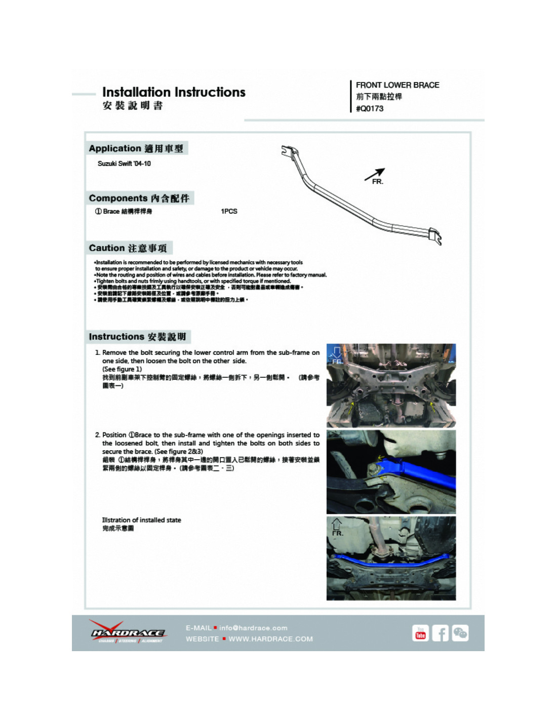 Barra rinforzo Hardrace per Suzuki Swift. Ideale per migliorare la precisione di guida, la stabilità dell'assetto e la risposta dello sterzo. Caratteristiche dal produttore : - * Does not fit MT Models * Not for Corolla 10th US spec 2.4L* Not for Corolla 10th US spec 2.4L 1 PCS/SET