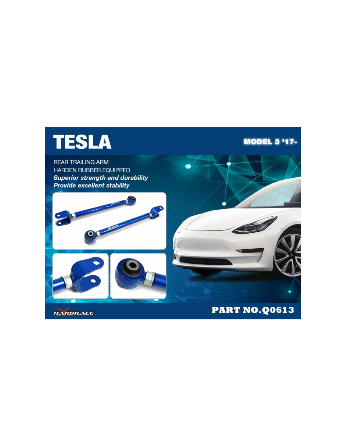 Braccio sospensione Hardrace per Rear Trailing Arm Tesla Model 3. Ideale per migliorare la precisione di guida, la stabilità dell'assetto e la risposta dello sterzo. Caratteristiche dal produttore : - Harden Rubber Equipped. 2 PCS/SET