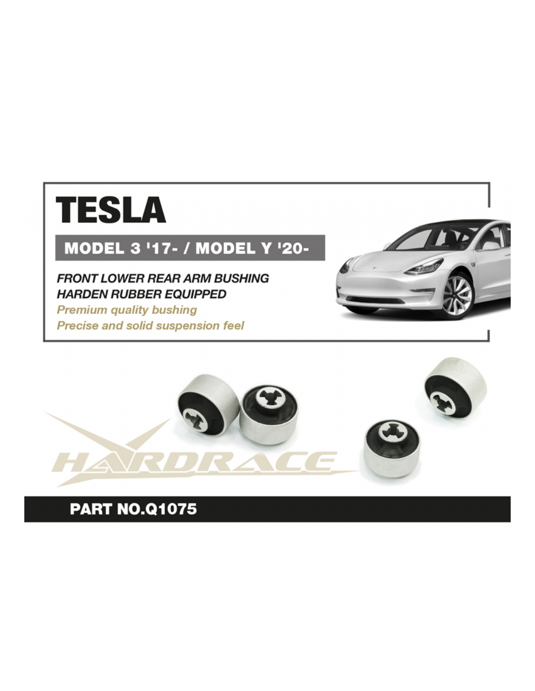 Silent block Hardrace per Front Lower Rear Arm Bushing Tesla Model 3, Model y. Ideale per migliorare la precisione di guida, la stabilità dell'assetto e la risposta dello sterzo. Caratteristiche dal produttore : - Harden Rubber Equipped 2PCS/SET