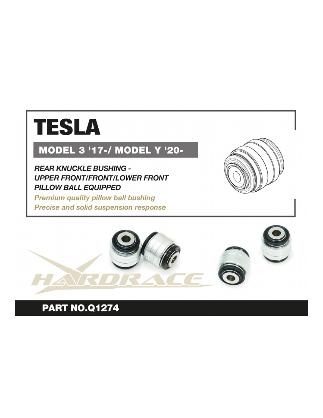 Silent block Hardrace per Rear Knuckle Bushing - Upper Front/front/lower Front Tesla Model 3, Model y. Ideale per migliorare la precisione di guida, la stabilità dell'assetto e la risposta dello sterzo. Caratteristiche dal produttore : - Pillow Ball Equipped Connect To Upper Front / Toe / Trailing Arms 2 PCS/SET