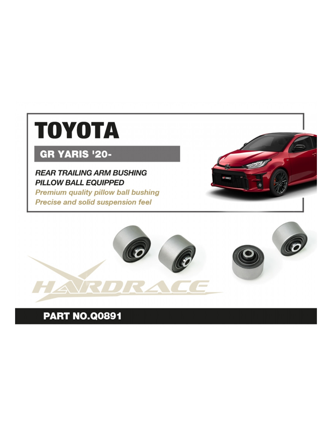 Silent block Hardrace per Toyota Yaris / vitz. Ideale per migliorare la precisione di guida, la stabilità dell'assetto e la risposta dello sterzo. Caratteristiche dal produttore : - Pillow Ball Equipped " Corolla Cross '20-: For AWD Use Only 2 PCS/SET