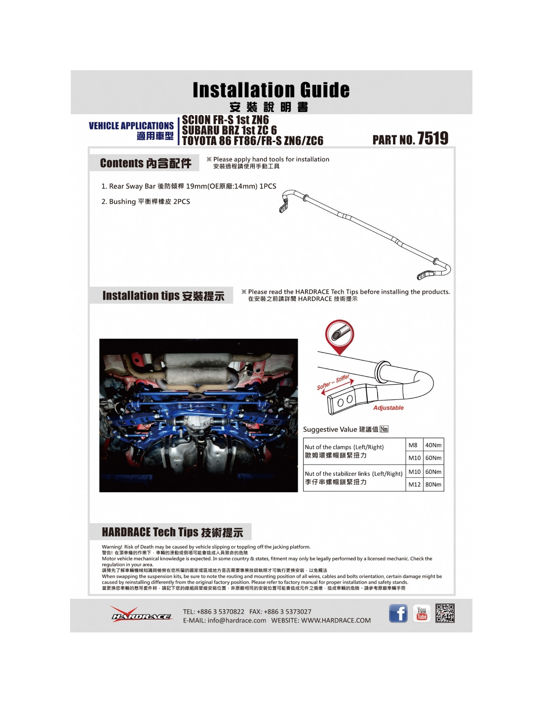 Barra stabilizzatrice Hardrace per Scion FR-S, Subaru BRZ, Toyota 86. Ideale per migliorare la precisione di guida, la stabilità dell'assetto e la risposta dello sterzo. Caratteristiche dal produttore : - 19mm, 3PCS/SET