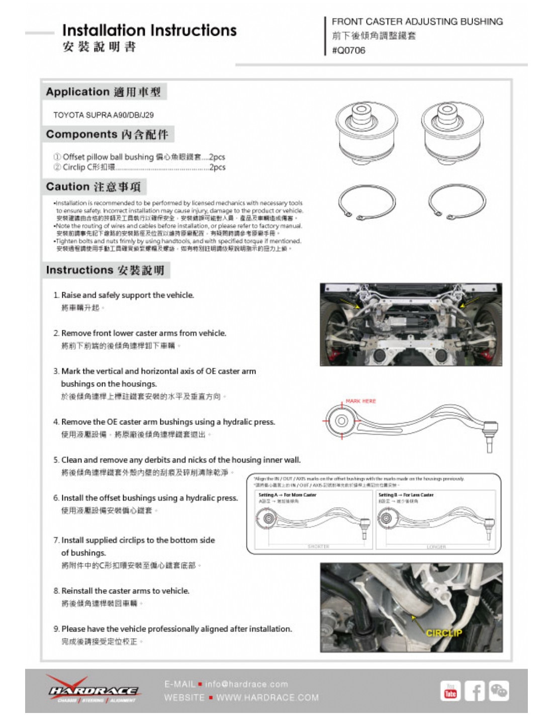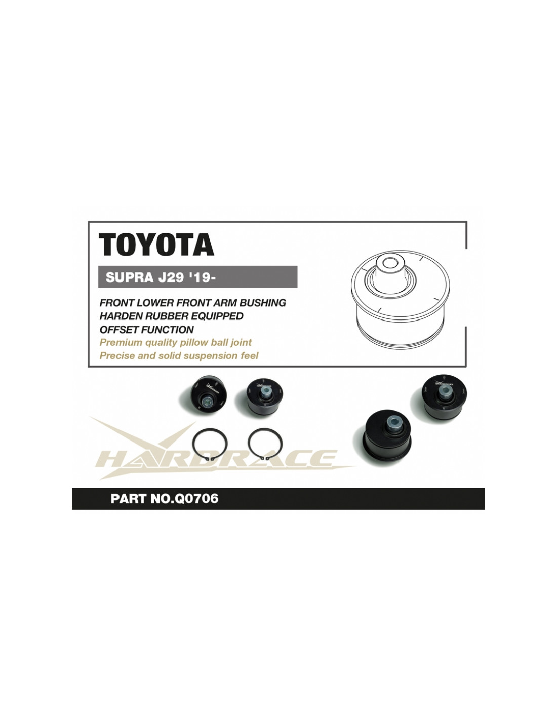 Silent block Hardrace per BMW Z4, Toyota Supra. Ideale per migliorare la precisione di guida, la stabilità dell'assetto e la risposta dello sterzo. Caratteristiche dal produttore : - Pillow Ball Equipped Offset Function / Caster +1 degree 2 PCS/SET