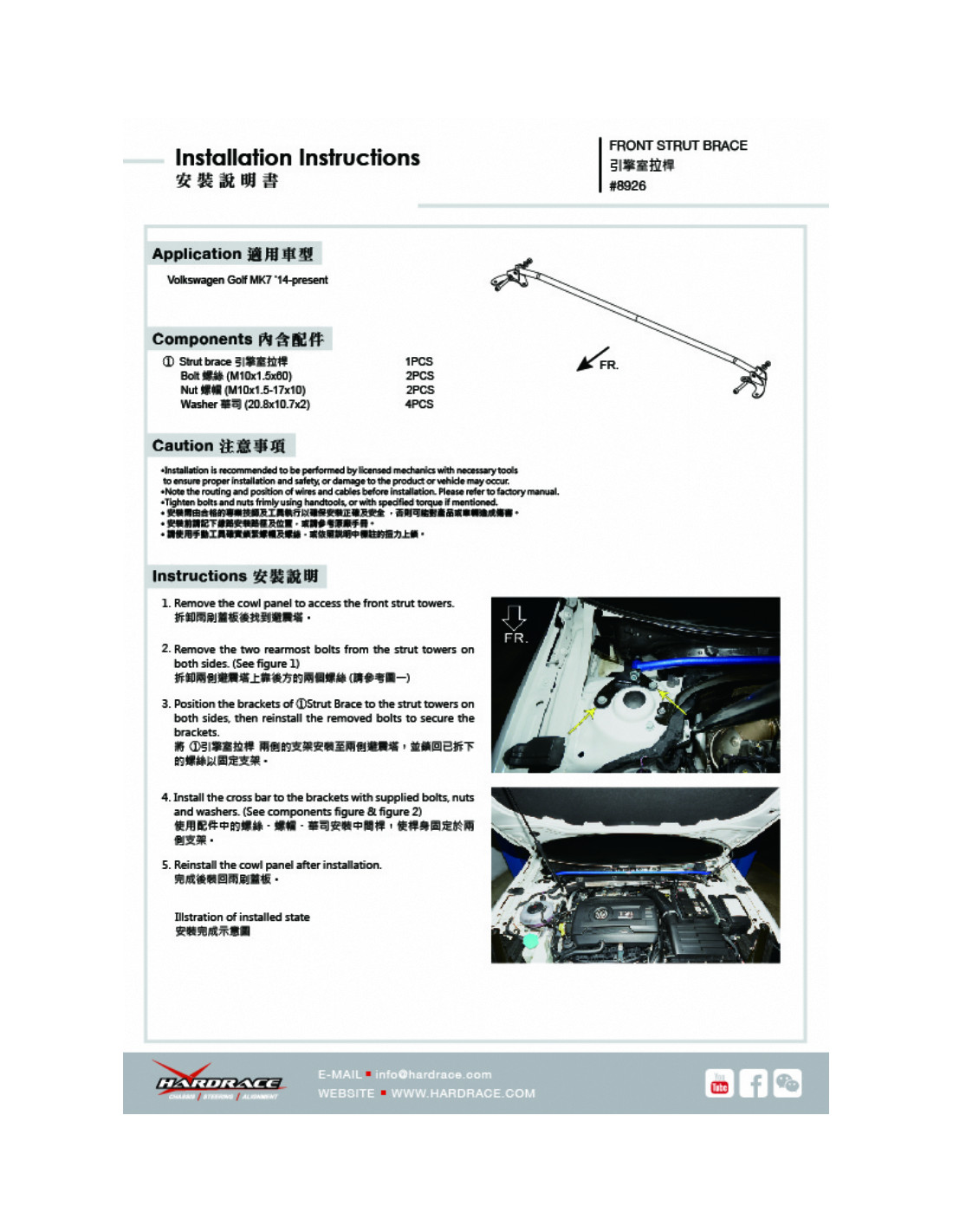 Barra rinforzo Hardrace per Volkswagen Golf, Golf r. Ideale per migliorare la precisione di guida, la stabilità dell'assetto e la risposta dello sterzo. Caratteristiche dal produttore : - 1 PCS/SET