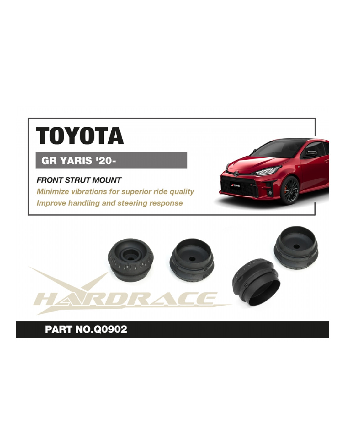Silent block Hardrace per Toyota Yaris / vitz. Ideale per migliorare la precisione di guida, la stabilità dell'assetto e la risposta dello sterzo. Caratteristiche dal produttore : - *GR Yaris: For 2020-2023 Pre-facelift Models Only 2 PCS/SET